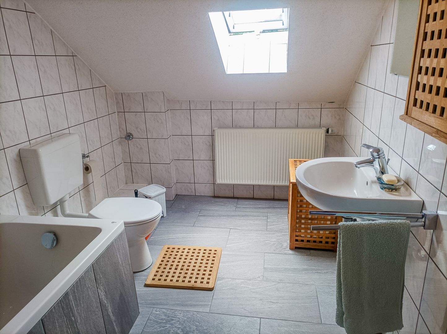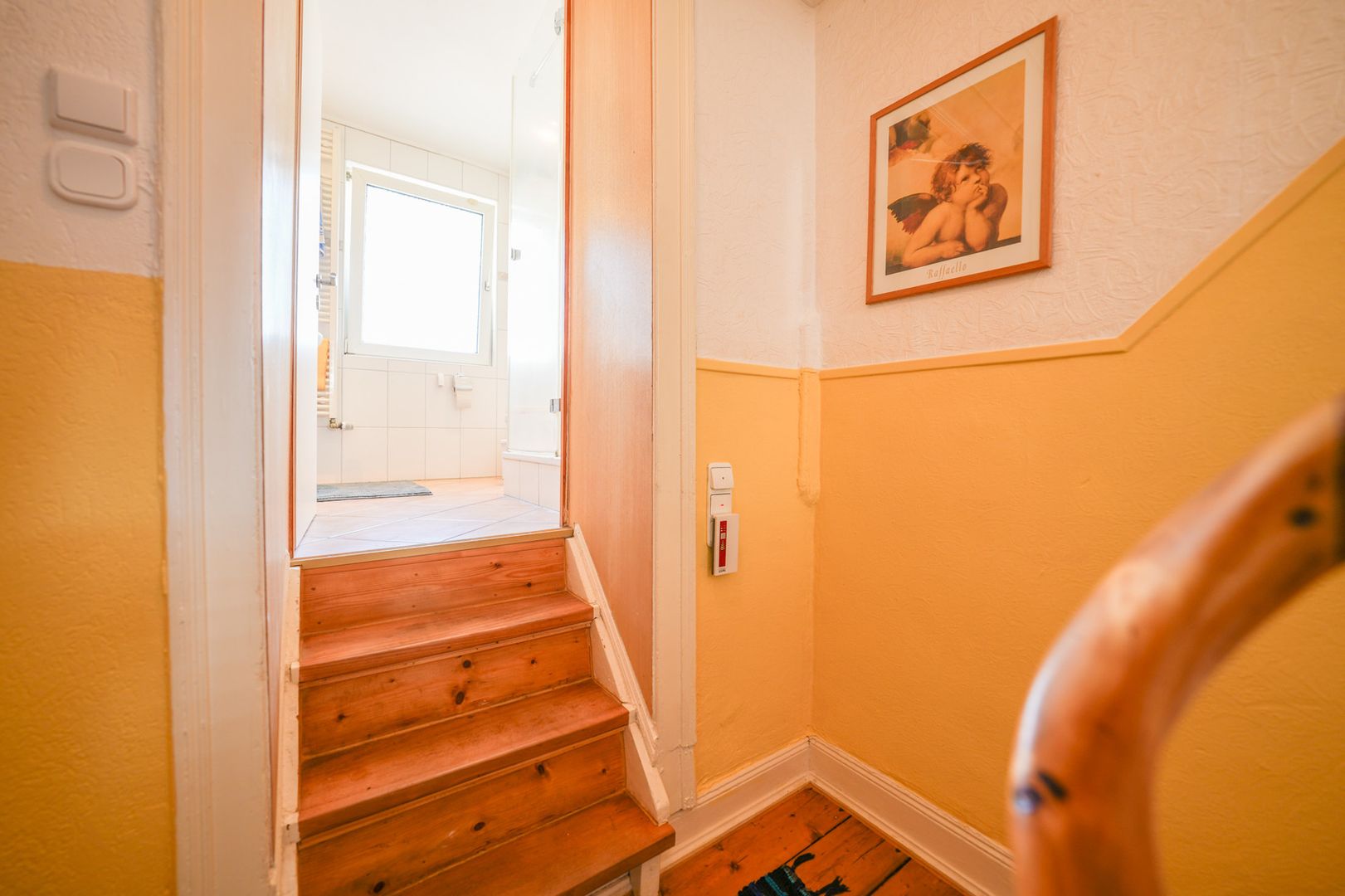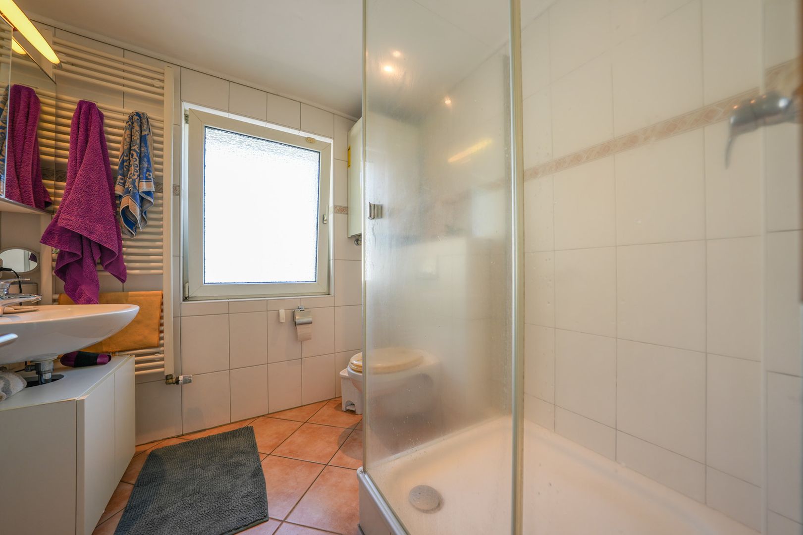 Ein helles Tageslichtbad mit Dusche befindet sich auf der Zwischenebene, praktisch gelegen zwischen den verschiedenen Lebensbereichen und ideal für Familien oder Gäste.