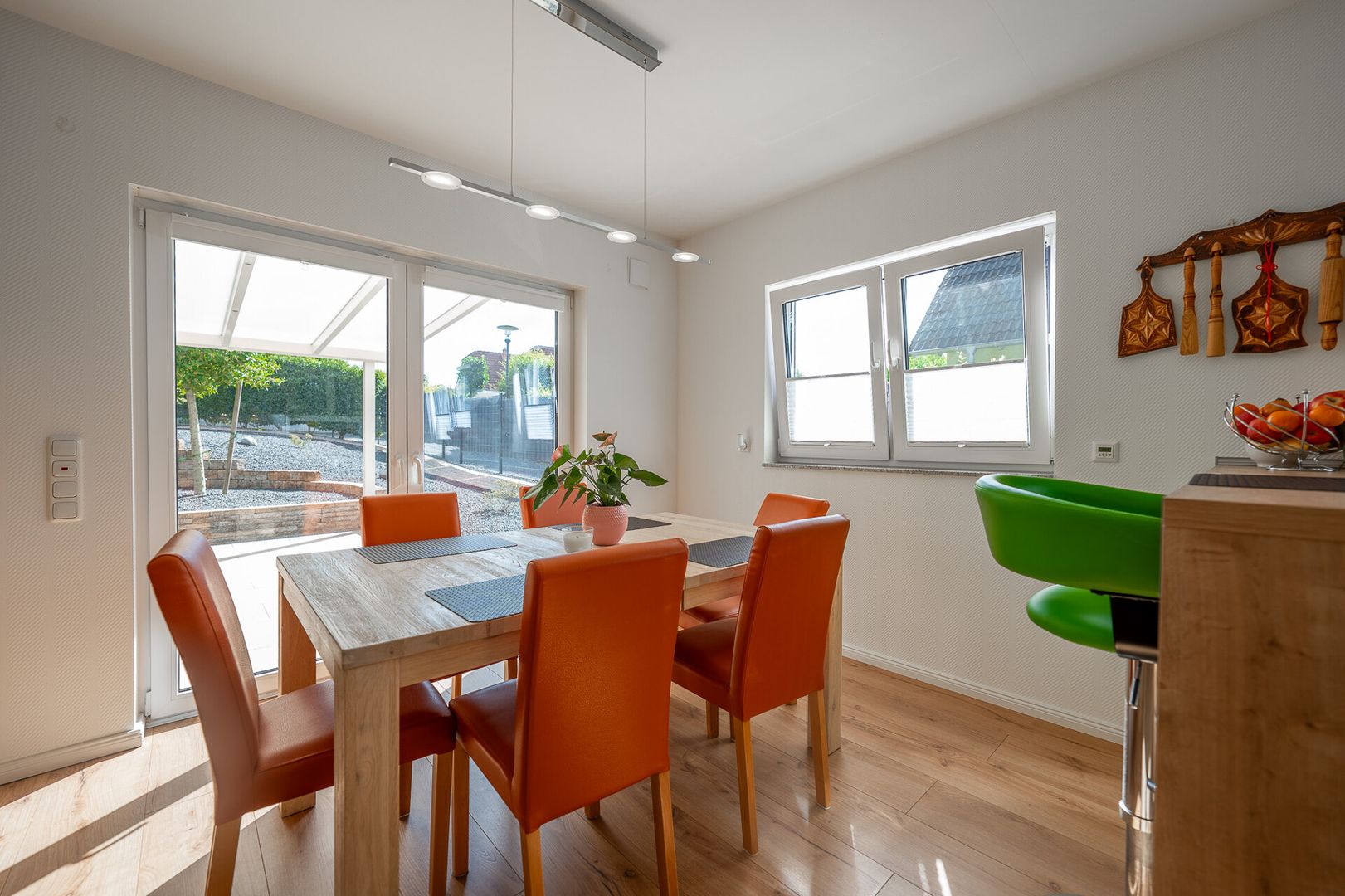- Großzügiger, offener Wohn-Ess-Kochbereich mit Zugang auf die überdachte Süd-Terrasse und herrlichem Blick in den Garten – der ideale Platz für
