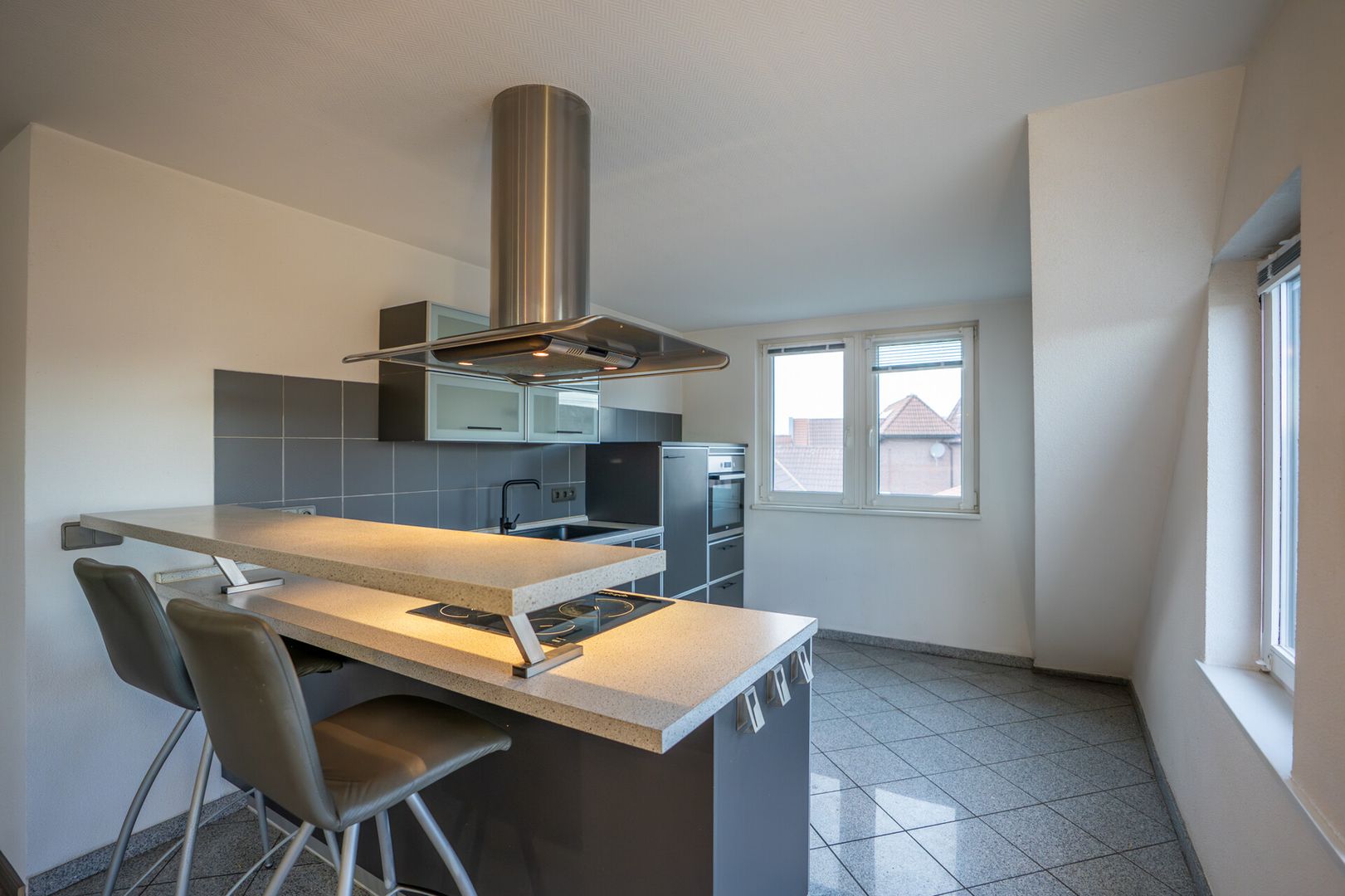 Der offene Wohnbereich ist das Herzstück der Wohnung und bietet viel Platz für Ihre individuellen Gestaltungsideen. Für wohlige Wärme sorgt der Pelletofen der Marke Palazzetti, der die Hauptwärme liefert und daher die Heizungsanlage nur in seltenen Fällen benötigt wird. Ergänzend sorgt eine Split-Klimaanlage im Schlafzimmer für angenehme Temperaturen – sowohl zum Kühlen im Sommer als auch zum Wärmen in der Übergangszeit.