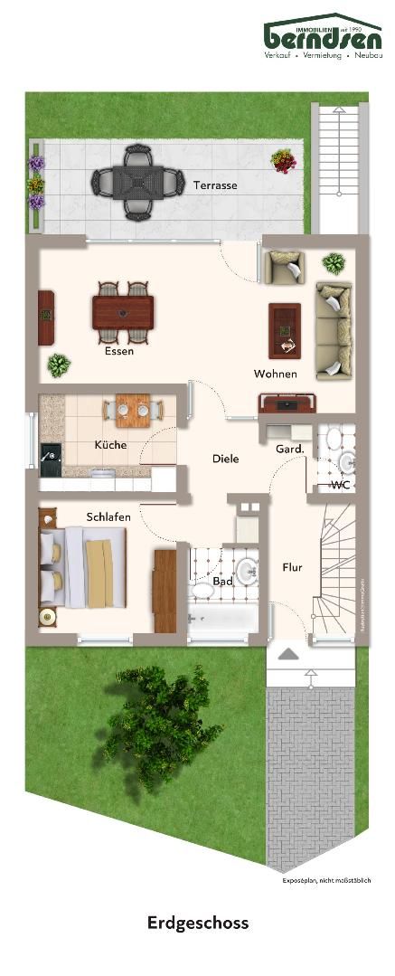 Von hier aus gelangen Sie über die Terrassentür auf die großzügige Terrasse und den Garten mit Garten- Saunahaus. Das Grundstück ist gen Süd- Westen ausgerichtet.