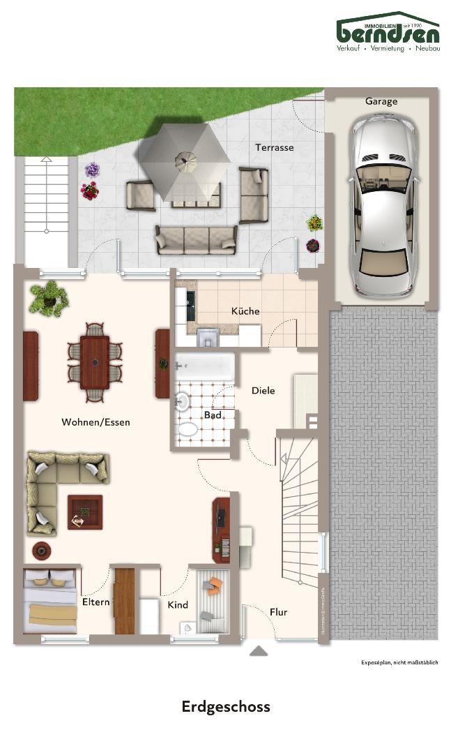 Das pflegeleichte Grundstück hat eine Größe von ca. 326 m² und ist von der Eerdgeschosswohnung aus begehbar.