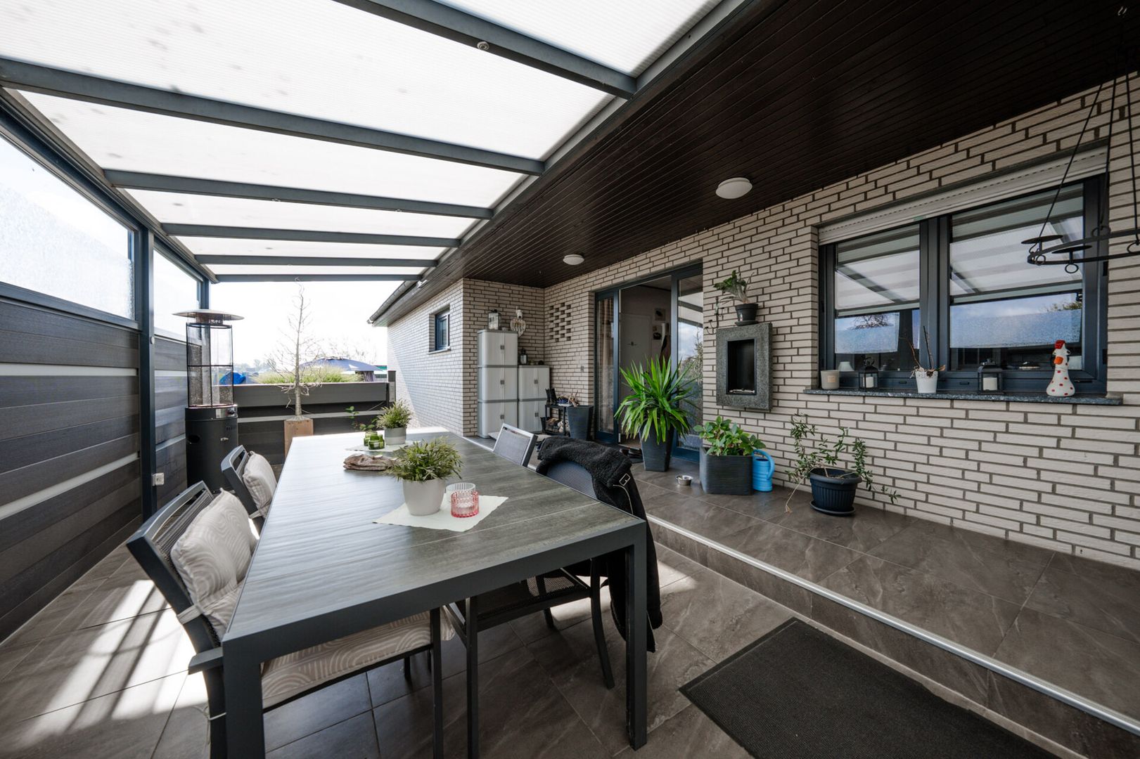 - Überdachte Terrasse, die den Wohnraum nach draußen erweitert und den Garten elegant