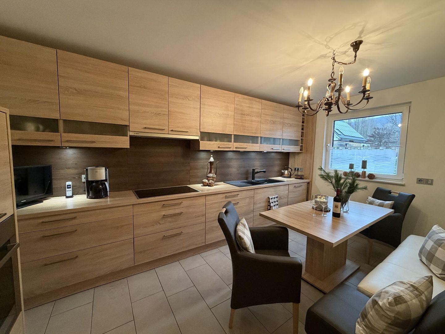 Die moderne Einbauküche mit E- Geräten und einer Sitzgruppe verbleibt im Haus und ist bereits im Kaufpreis enthalten.