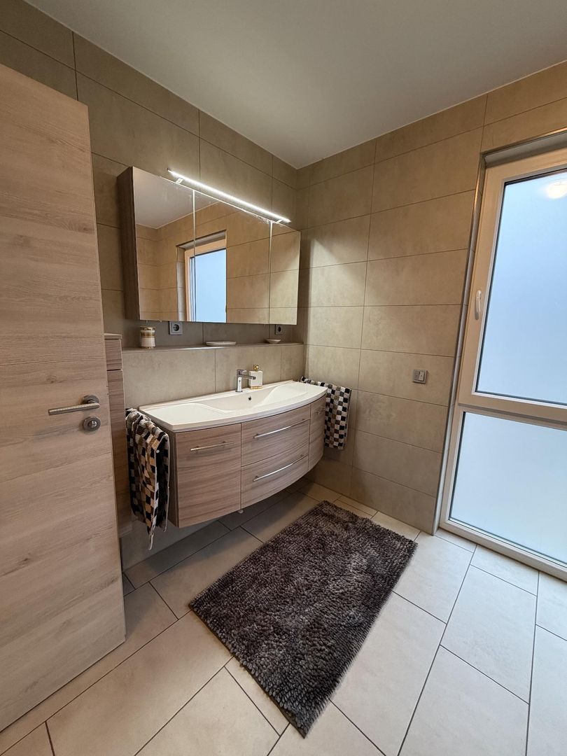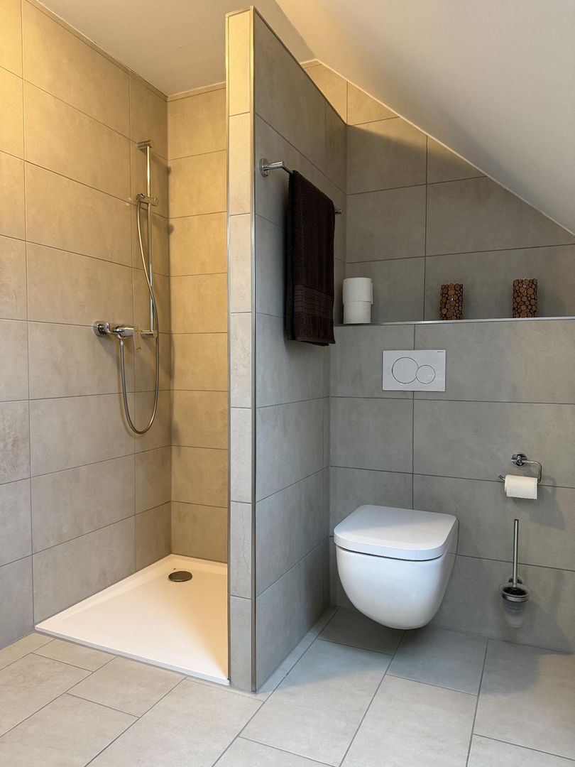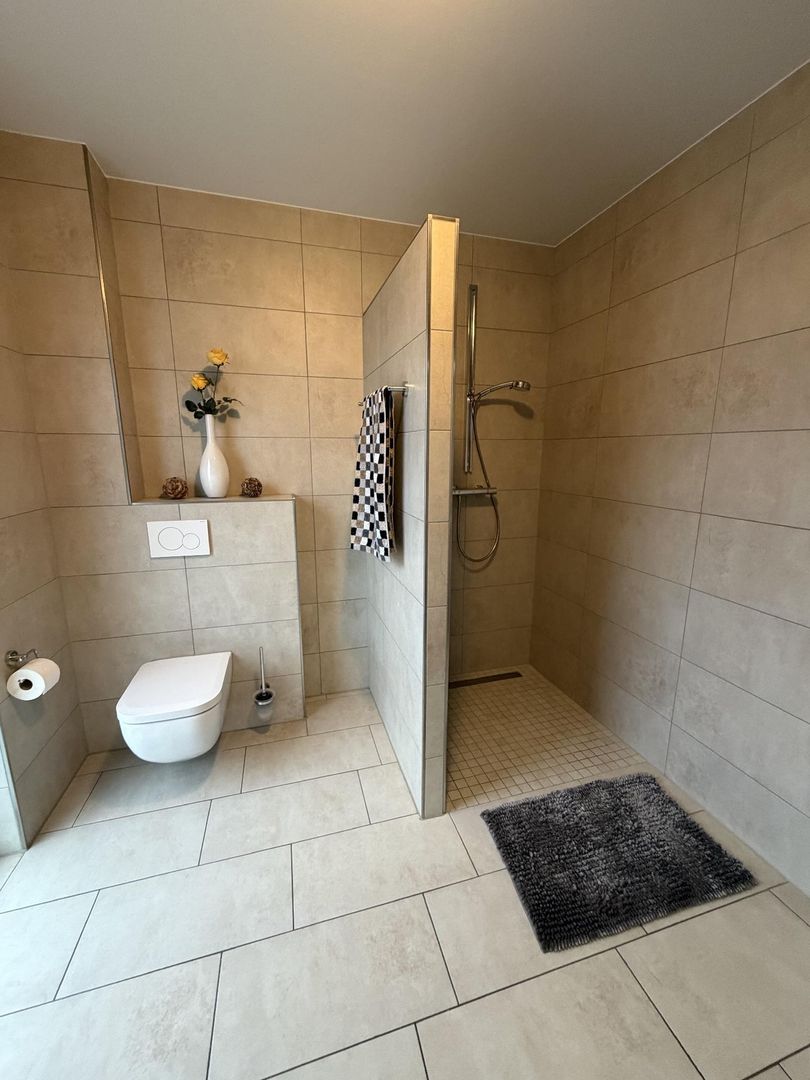° schickes Badezimmer mit großzügiger bodentiefer Dusche, Fenster