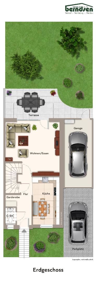 Der Garten wurde vor wenigen Jahren von einem Garten- und Landschaftsbaubetrieb gestaltet und ist pflegeleicht angelegt ideal für Berufstätige und Familien.