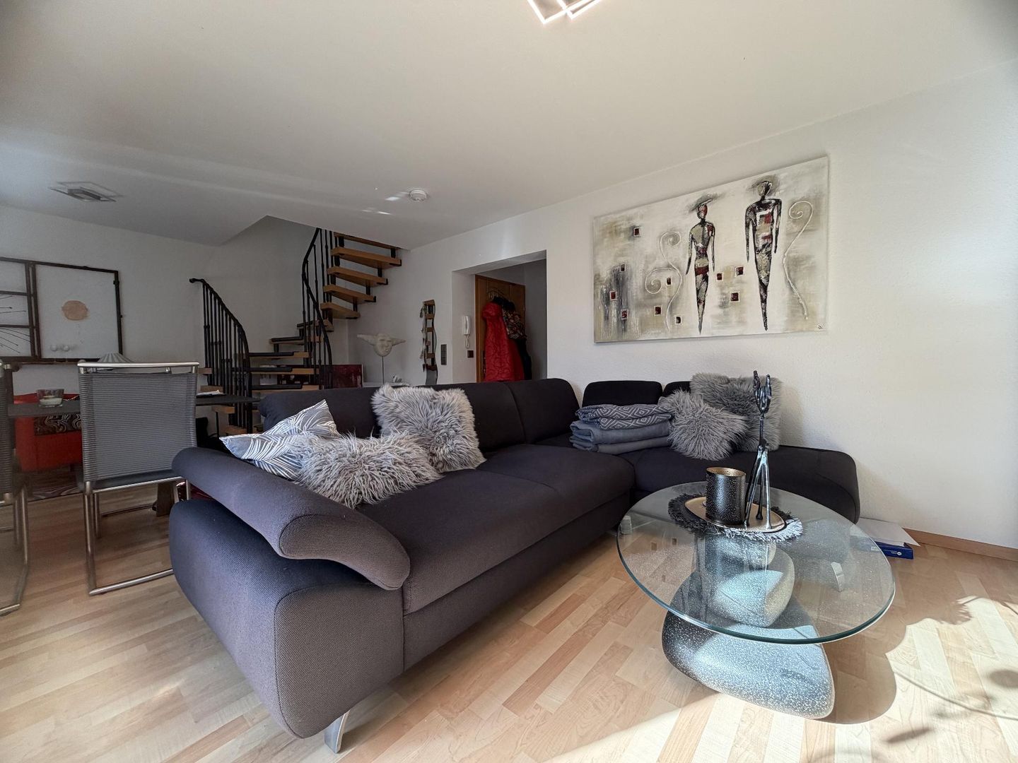 Im hinteren Bereich des Wohnzimmers befindet sich eine Treppe, die zum Dachgeschoss führt. Hier befinden sich das Badezimmer sowie das gemütliche Schlafzimmer mit Einbau- Kleiderschrank. Ein zusätzlicher kleiner Bereich dient als Abstellkammer.