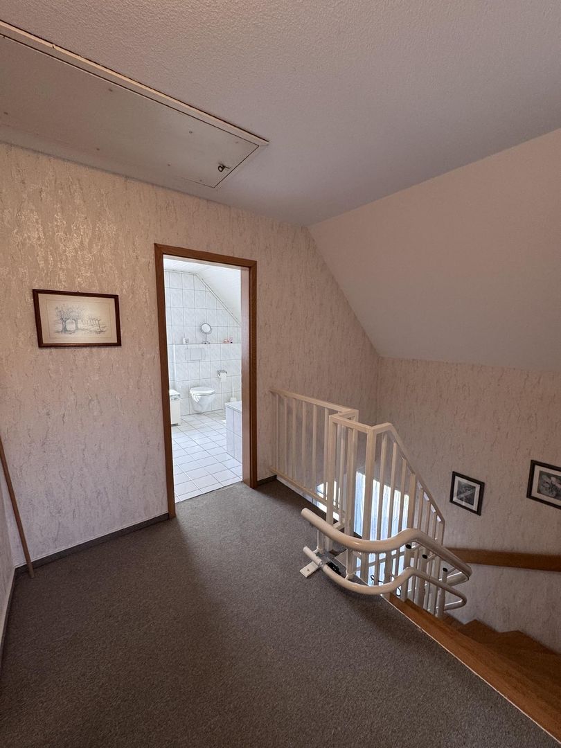 Über die Stahltreppe mit Holzstufen gelangen Sie in das Obergeschoss der Immobilie. Der vorhandene Treppenlift kann bei Bedarf im Haus verbleiben, ansonsten wird der Lift abgebaut. Die Aufteilung des oberen Geschosses ist ideal für ein Paar, die zwei separate Arbeitszimmer benötigen. Aber auch eine Familie mit 2 Kindern finden hier ausreichend Platz zum Entfalten. Hier stehen Ihnen nämlich 2 Kinderzimmer/ Arbeitszimmer, ein großzügiges Badezimmer sowie ein Elternzimmer zur Verfügung. Der Spitzboden ist nicht ausgebaut, jedoch gedämmt. Das Badezimmer hat eine vorteilhafte Größe und ist mit Dusche und Badewanne ausgestattet. Pluspunkt ist das große Fenster.