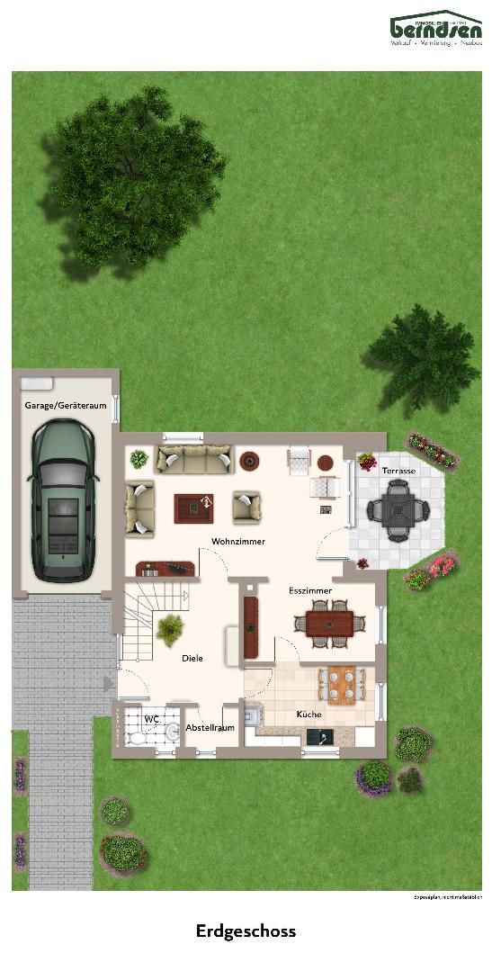 Erdgeschoss: Diele, Abstellkammer, Gäste- WC, Küche, Wohn- / Esszimmer mit Terrasse