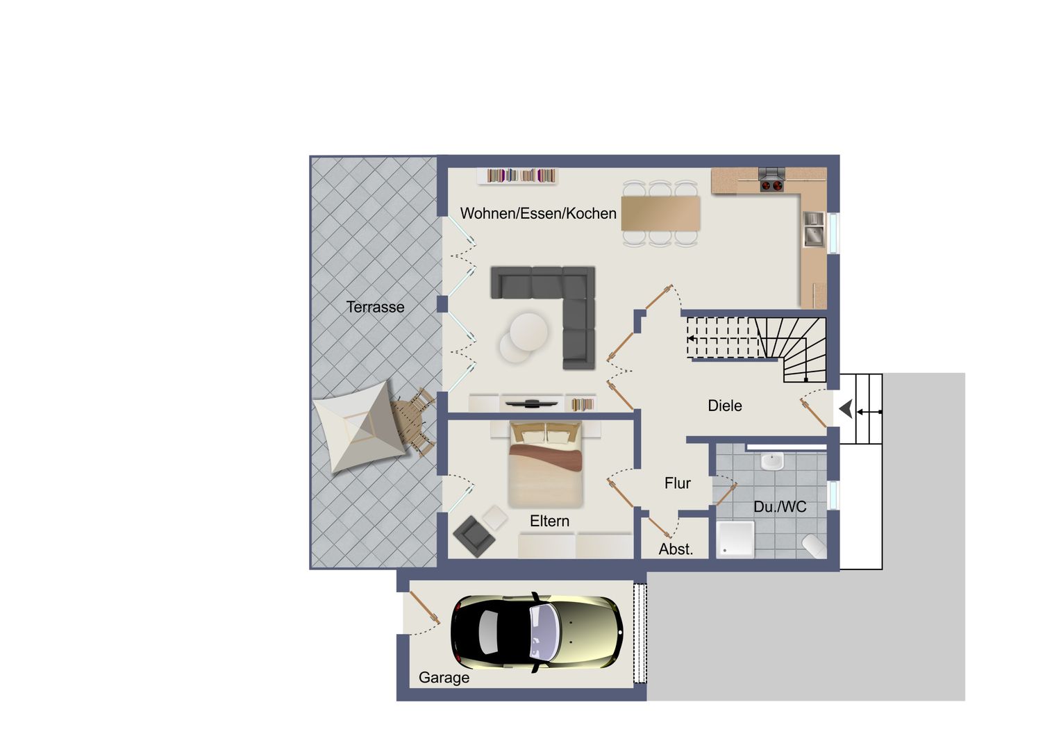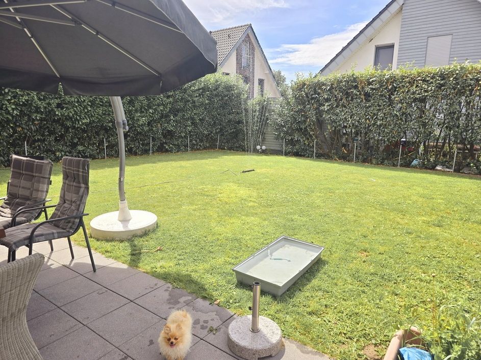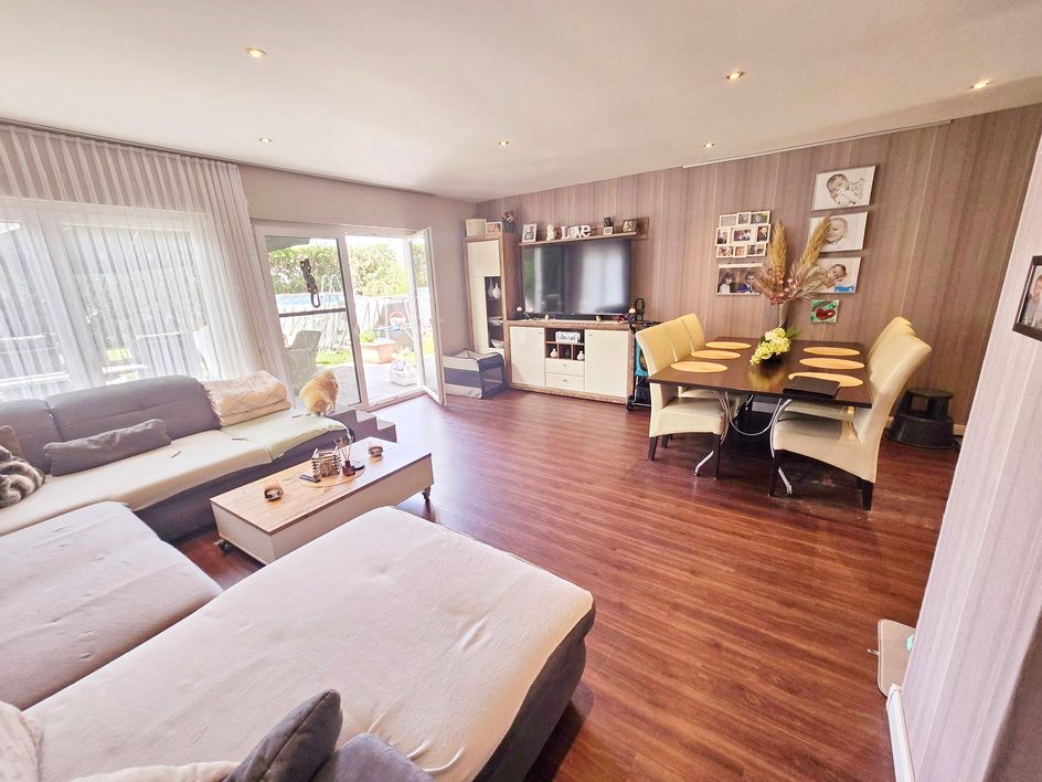 Das Herzstück des Hauses ist die großzügige Terrasse, die direkt vom Wohnbereich aus zugänglich ist. Hier können Sie laue Sommerabende mit Freunden und Familie verbringen oder einfach die Ruhe des Gartens genießen. Der angrenzende Pool lädt dazu ein, an heißen Tagen eine erfrischende Abkühlung zu nehmen.