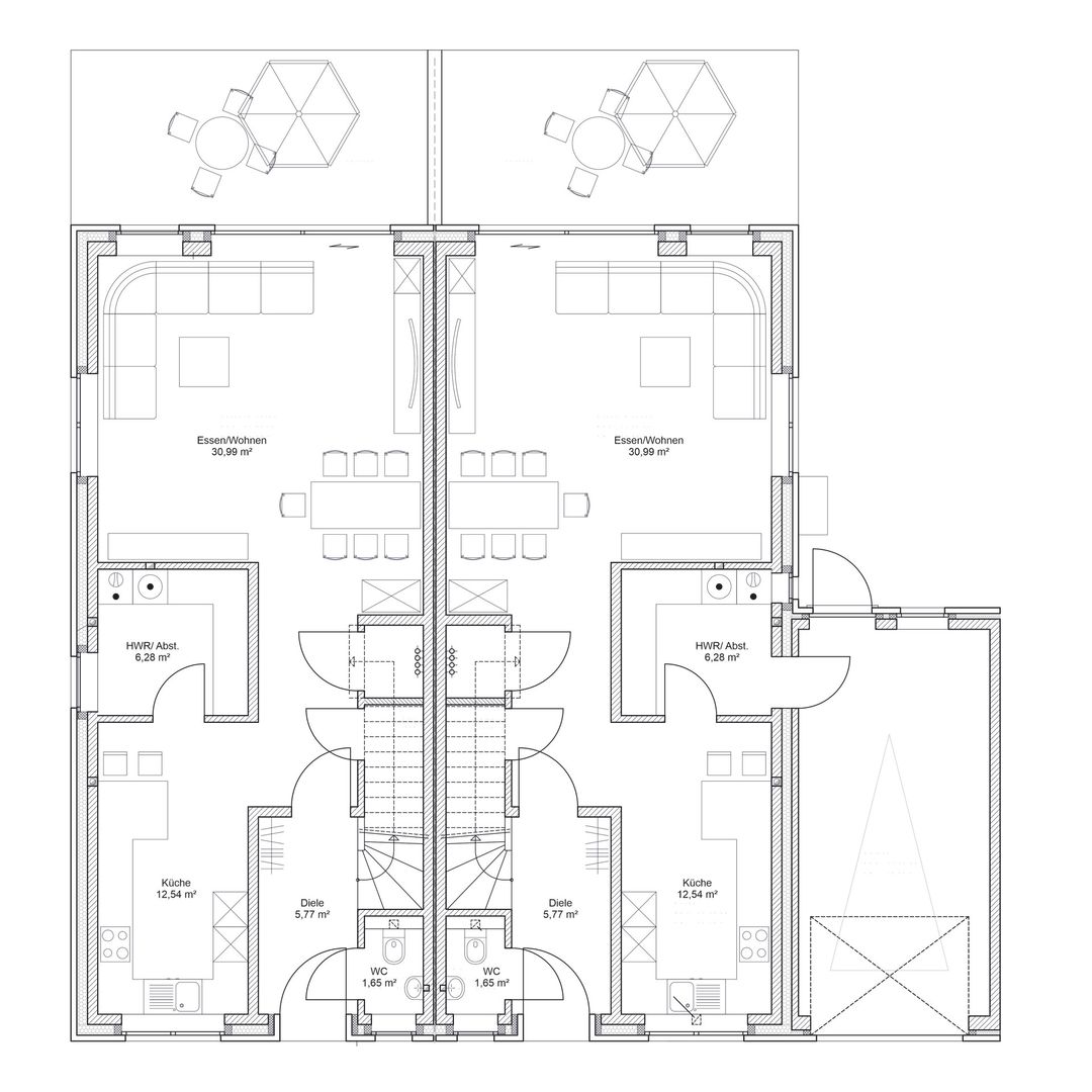 Schon das Erdgeschoss öffnet sich mit einer einladenden Diele – der Moment des Ankommens fühlt sich hier einfach richtig an. Das Gäste-WC liegt diskret zur Seite, bevor der Weg weiterführt in einen offen gestalteten Wohn-, Ess- und Kochbereich. Groß, klar, freundlich – ein Raum, der verbindet. Und durch die großen Terrassentüren geht der Blick direkt ins Freie: Ostausrichtung, Morgensonne, Vogelstimmen. Ein Frühstück draußen, bevor der Tag beginnt – so fühlt sich Leichtigkeit an. Die angrenzende Küche ist praktisch geplant, ergänzt durch einen Hauswirtschaftsraum, der alles verstaut, was den Alltag erleichtert.