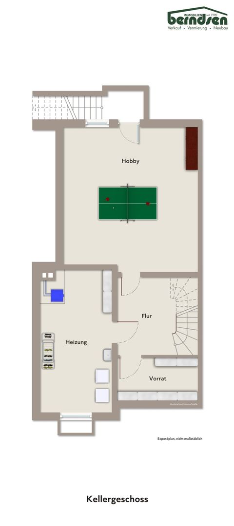 Klarer Vorteil von diesem Bestandsbau: das Haus ist vollunterkellert und bietet einen großen Hobbyraum mit direktem Zugang zum Garten, einen Waschraum sowie den Heizungsraum. Der Keller eröffnet zusätzliche Nutzungsmöglichkeiten für Homeoffice, Sport und /oder Spielen.