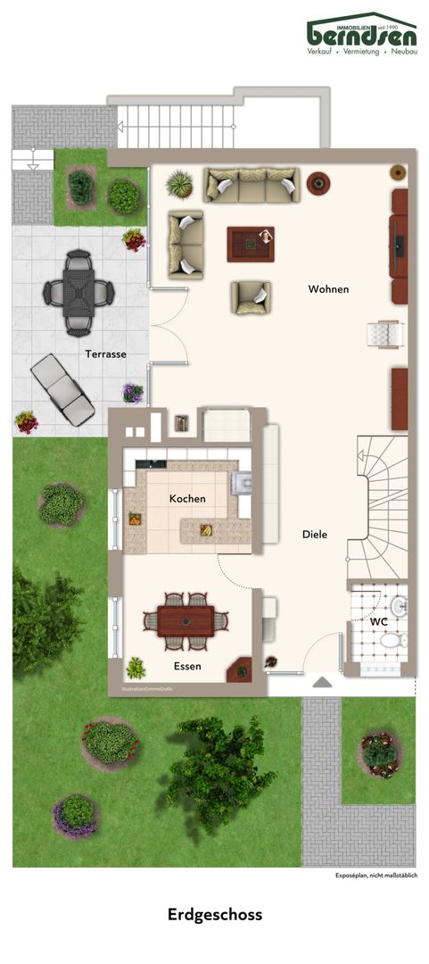 Diele, Gäste- WC, separate Essküche mit Austritt, Wohn-/ Esszimmer mit Terrasse