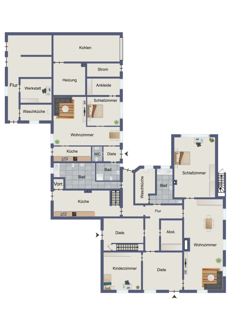 Zusätzlich verfügt die Immobilie über eine Vielzahl von Annehmlichkeiten, die Ihren Wohnkomfort erhöhen, darunter eine moderne Küche, geräumige Schlafzimmer und stilvoll gestaltete Badezimmer. Insgesamt verfügt die zweigeschossige Immobilie über 8 Wohn-/Schlafzimmer, 3 Küchen, 4 Badezimmer, Nebenräume und ca. 300 m² weitere Ausbaureserven.