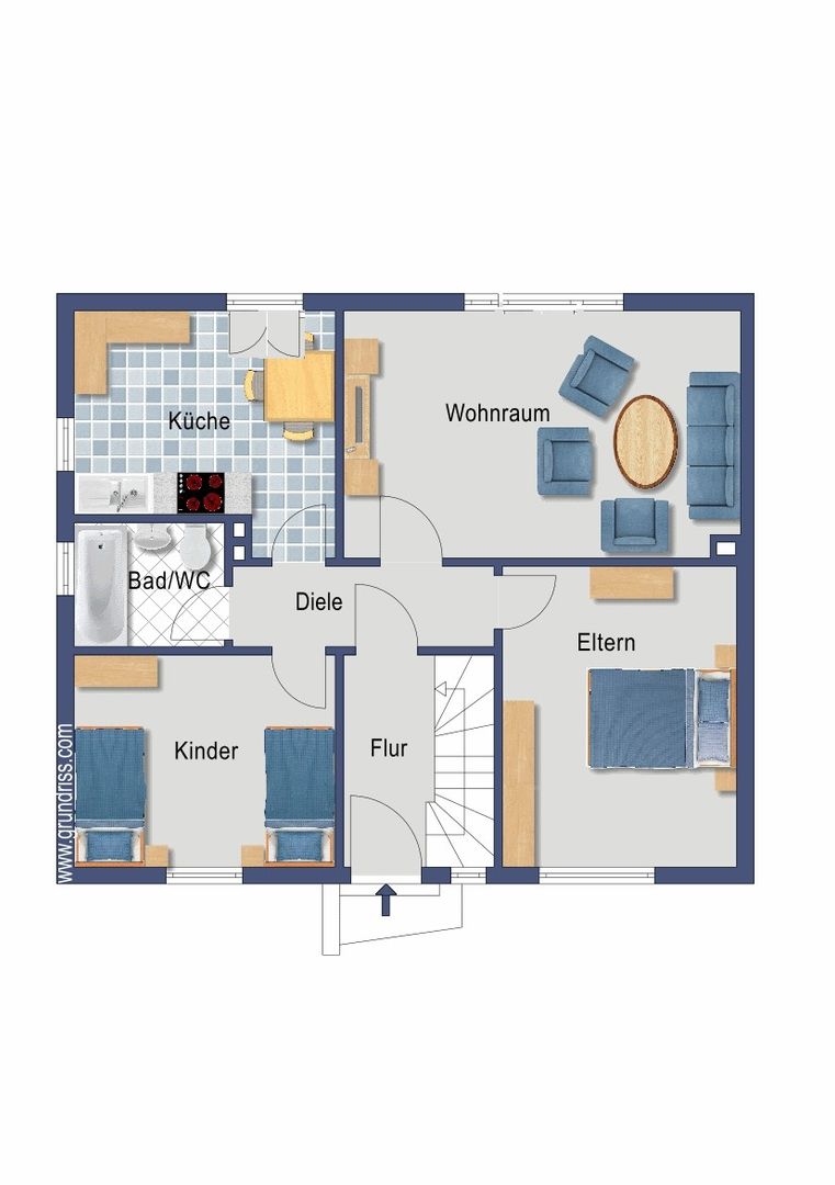 Die Erdgeschosswohnung ist aufgeteilt in: Wohnzimmer, Schlafzimmer, Kinderzimmer, Bad sowie Küche plus Terrasse.