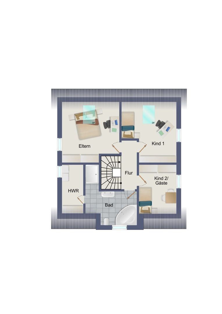 Die insgesamt vier Schlafräume befinden sich im Obergeschoss und ausgebautem Dach und verfügen teils über Klimaanlagen. Im Obergeschoss ist auch das große Tageslichtbad mit Eckwanne und großer Dusche sowie ein HWR mit Anschluss für eine Waschmaschine.