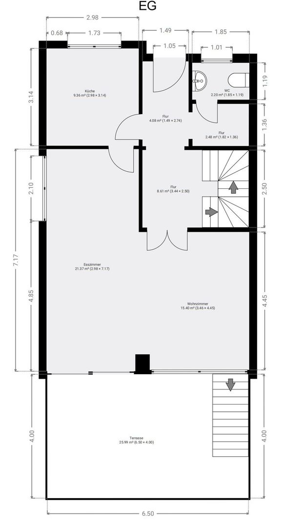 Im Erdgeschoss empfängt Sie ein einladender Eingangsbereich, der mit Fliesenboden, einem praktischen Einbauschrank, weiß lackierten Wandpaneelen und einer stilvollen dunklen Holzdecke gestaltet ist. Das helle Gäste-WC profitiert von natürlichem Tageslicht. Die moderne Küche, die sich in unmittelbarer Nähe zum Wohnbereich befindet, ist funktional und einladend. Das lichtdurchflutete Wohnzimmer, ausgestattet mit einer großen Glasfront zur Terrasse und grauem Vinylboden, verfügt über einen gemütlichen Kachelofen, der für eine angenehme Atmosphäre sorgt.