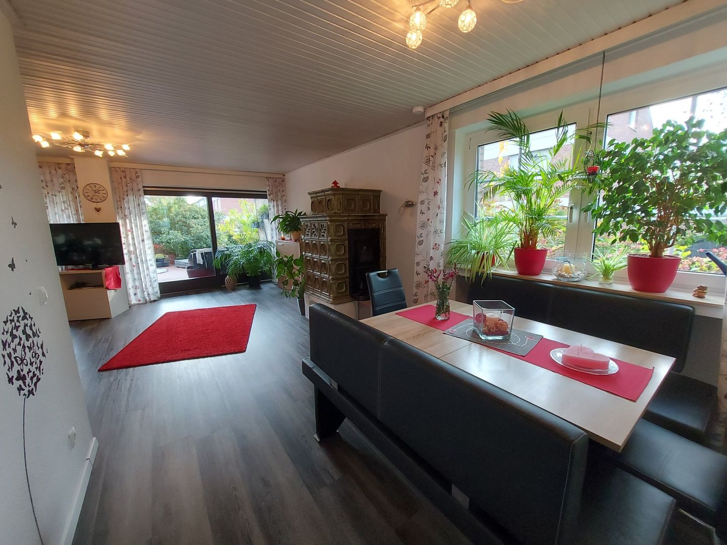 - Großes Wohnzimmer mit Schiebetür zur Terrasse und Kachelofen