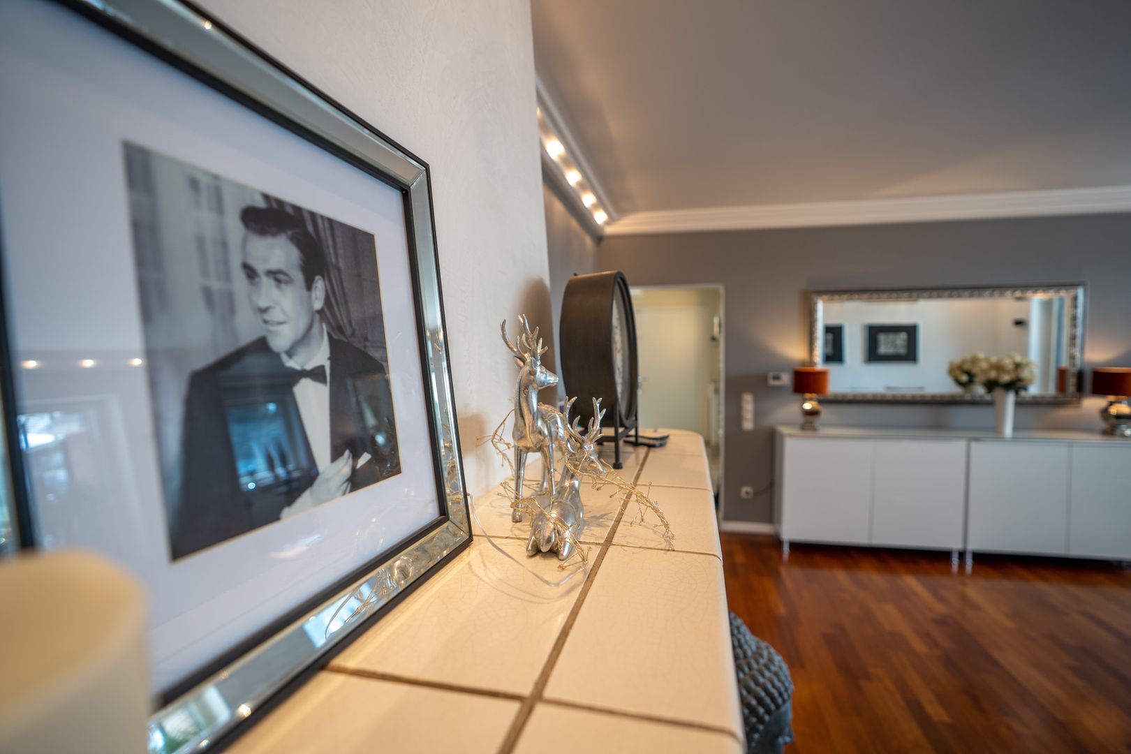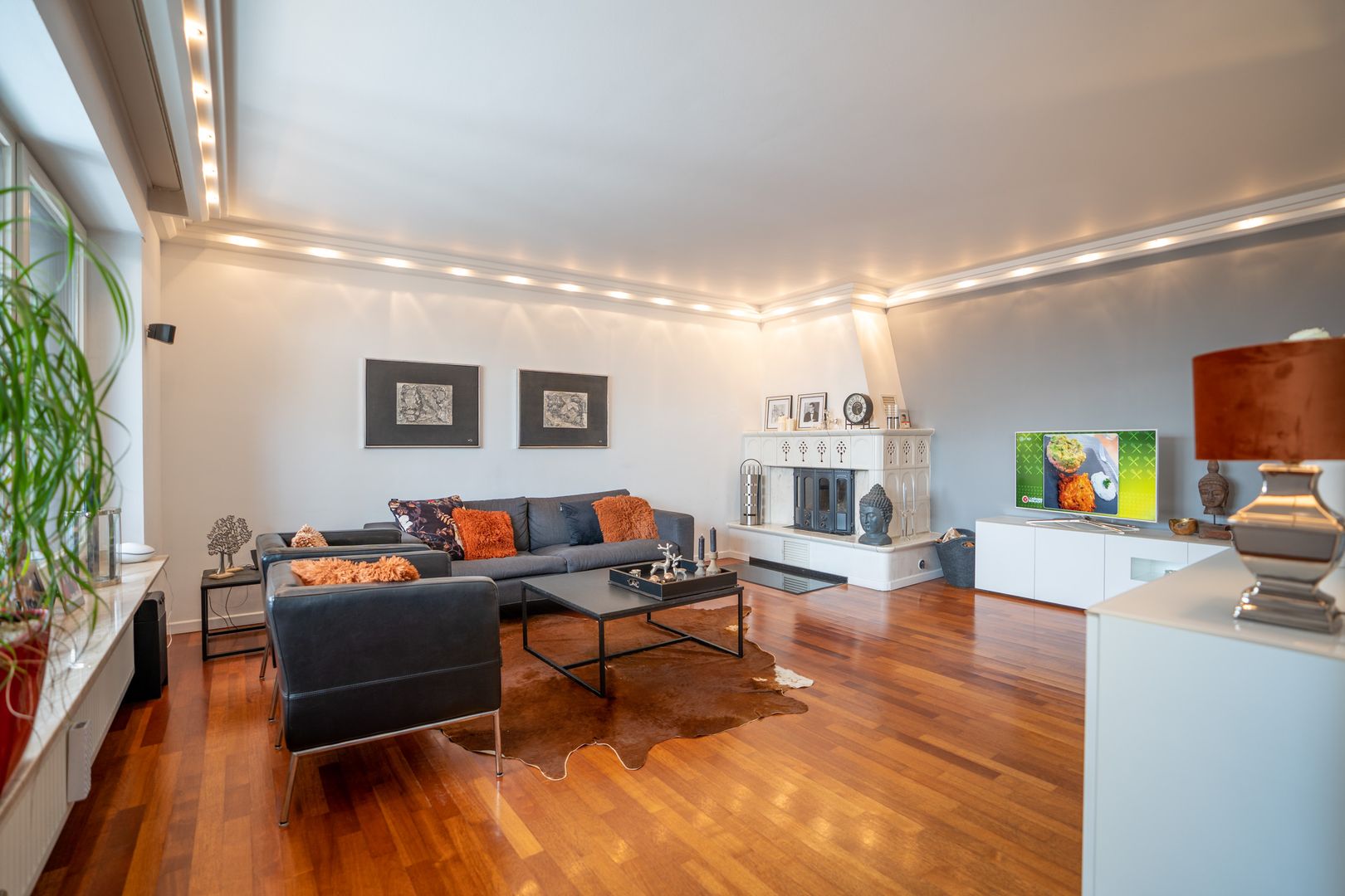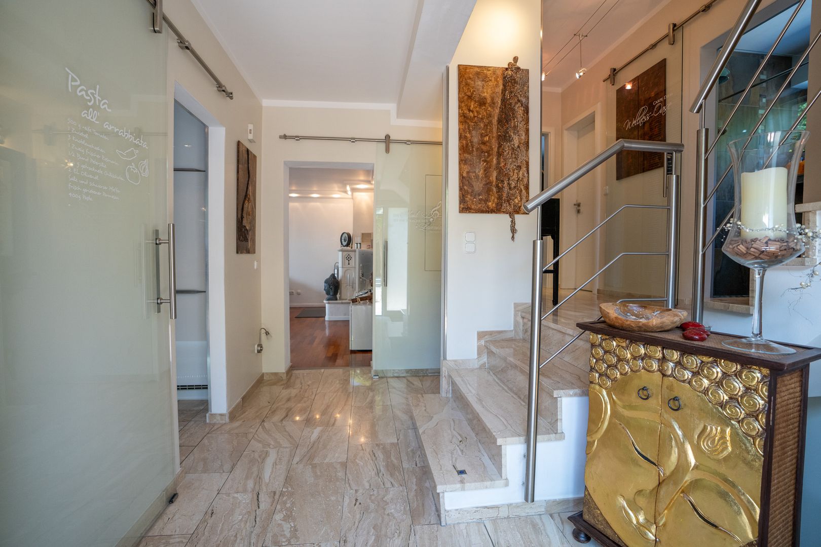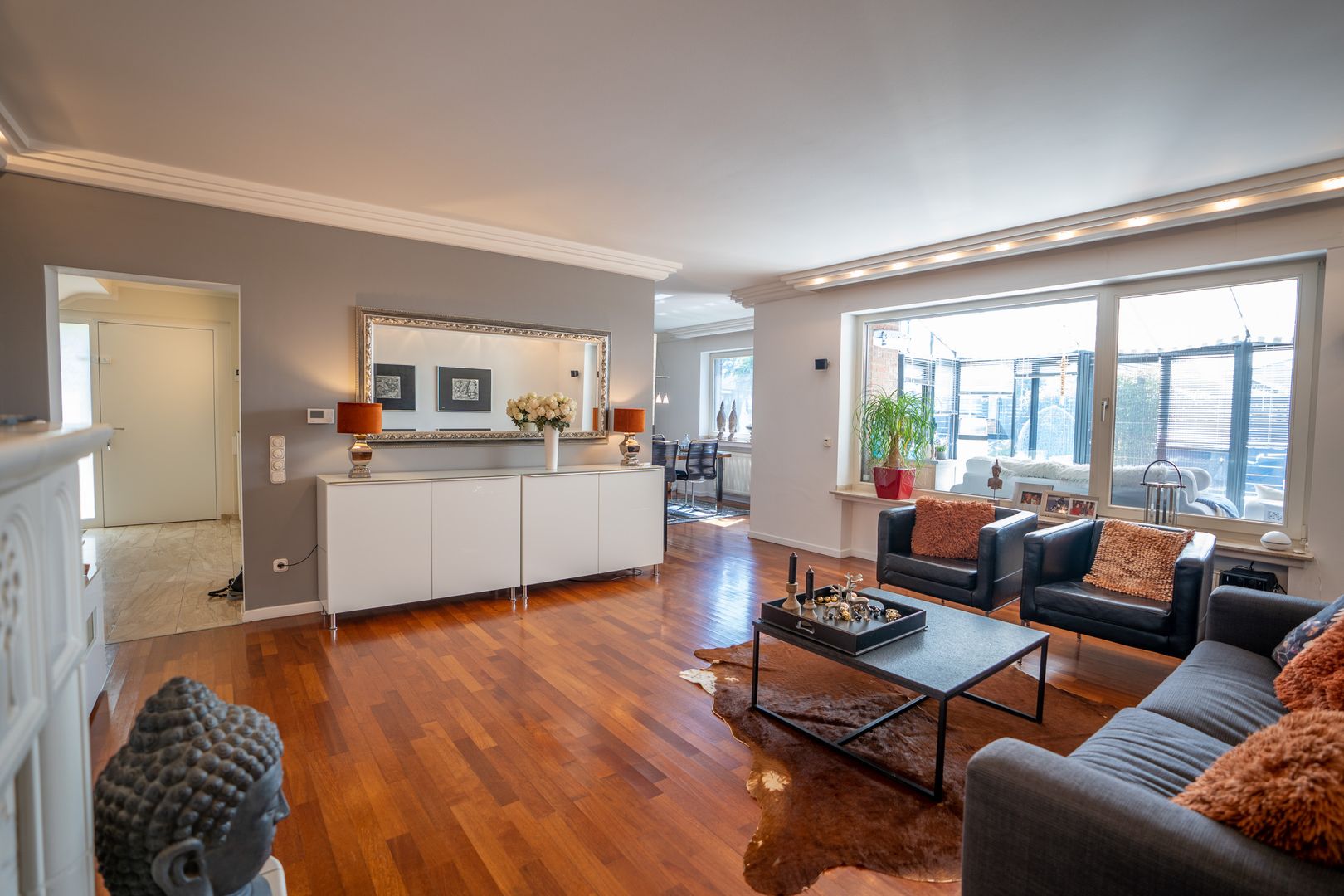 Alle Räume sind stillvoll, modern und individuell. Alles wirkt neu und liebevoll. Die Ausstattung und Einrichtung wünscht man sich. Die moderne Halbinselküche mit anschließendem Esstisch für die ganze Familie ist ein Traum. Der angrenzende Wohnbereich mit offenem Kamin ist sehr hell und gemütlich. Vom Wohnzimmer erreichen Sie bequem den großzügigen Wintergarten und den Vorgarten.