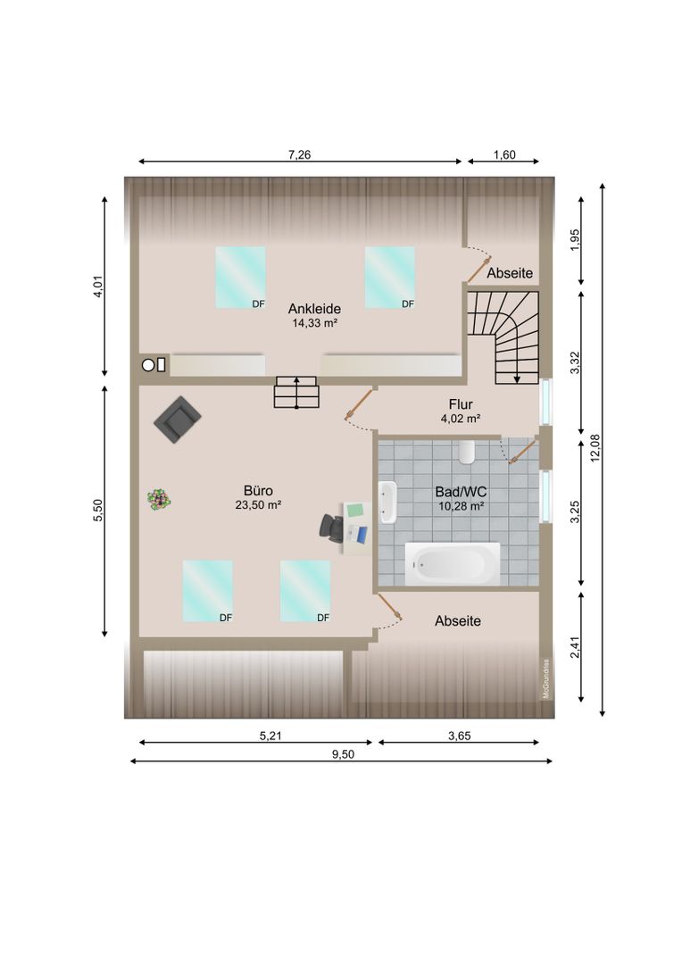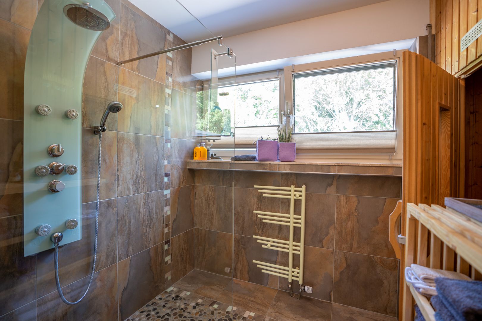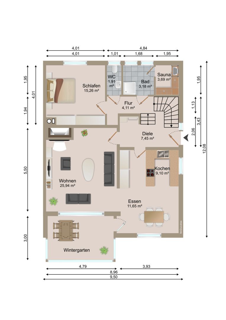 Ein paar Stufen vom Flur führen Sie zu und Ihrer privaten Wellness Oase mit riesiger Dusche und Sauna. Zudem finden Sie im Erdgeschoss Ihr Schlafzimmer mit direktem Zugang zum Hauptgarten. Die verbauten Materialien erinnern an Natur und Urlaub. Ihre Gäste nutzen Ihr eigenes Gäste WC.