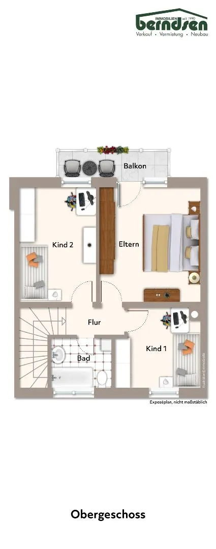 Flur, Kind 1, Badezimmer, Kind 2, Elternzimmer mit Balkon