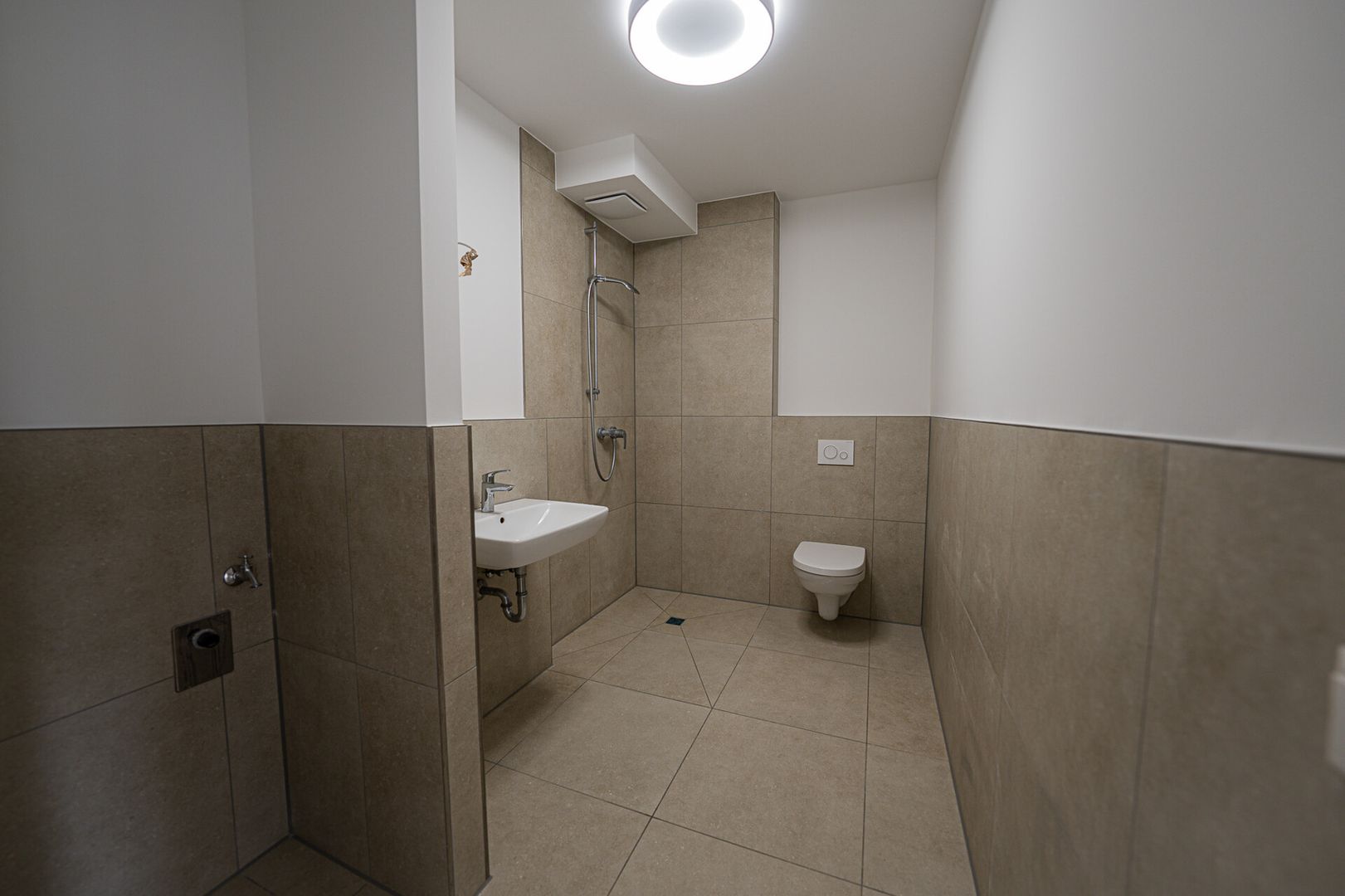 Besonders smart gelöst ist das innenliegende Badezimmer: ebenerdige Dusche, klare Linien, hochwertige Ausstattung – kompakt, aber durchdacht. Der integrierte Waschmaschinenanschluss spart Platz und Wege, ideal für den urbanen Alltag. Lediglich der finale Bodenbelag darf noch ganz nach den Vorstellungen des Käufers verlegt werden – so lässt sich der persönliche Stil perfekt einbringen.